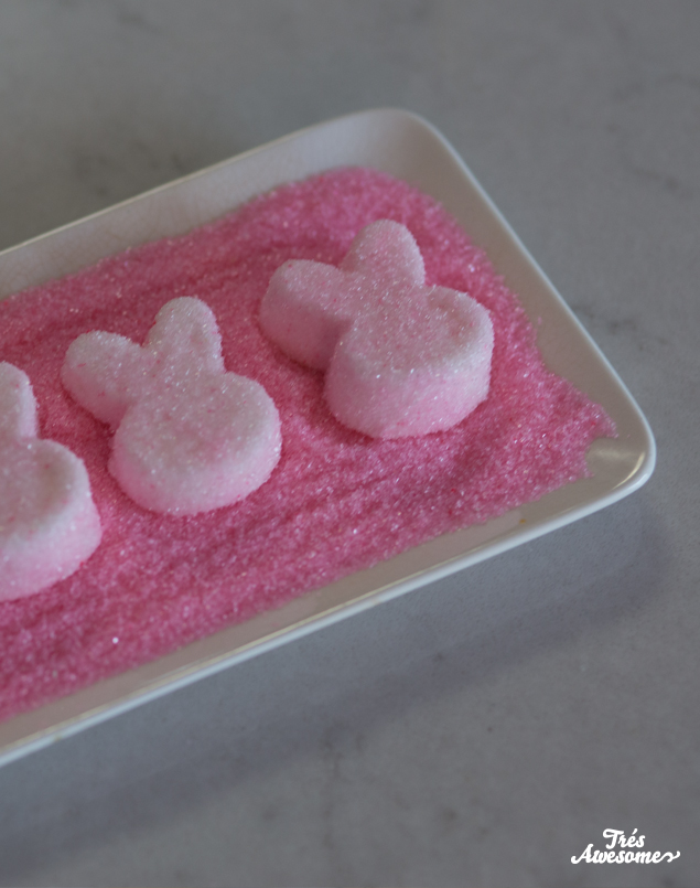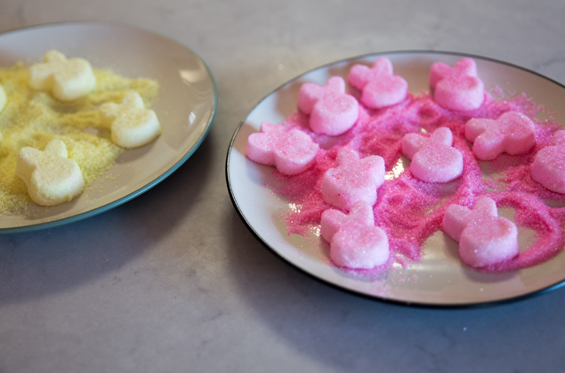 While you put aside the form for about 10 minutes while the marshmallows harden, put your colored sugar on a dish. Grease your hands slightly before you remove the bunnies from the mold.